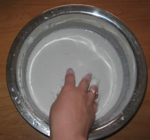 - rukou rozmiešame sádru tak aby neboli hrčky ani bublinky, pracujeme relatívne rýchlo, pretože je to rýchlotvrdnúca sádra |