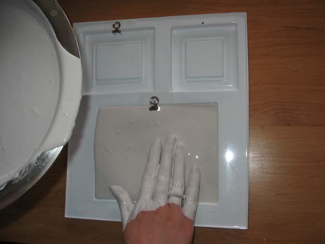 - rukou uhladíme sádru tak aby bola približne rovnomerne v strede aj v rohoch |