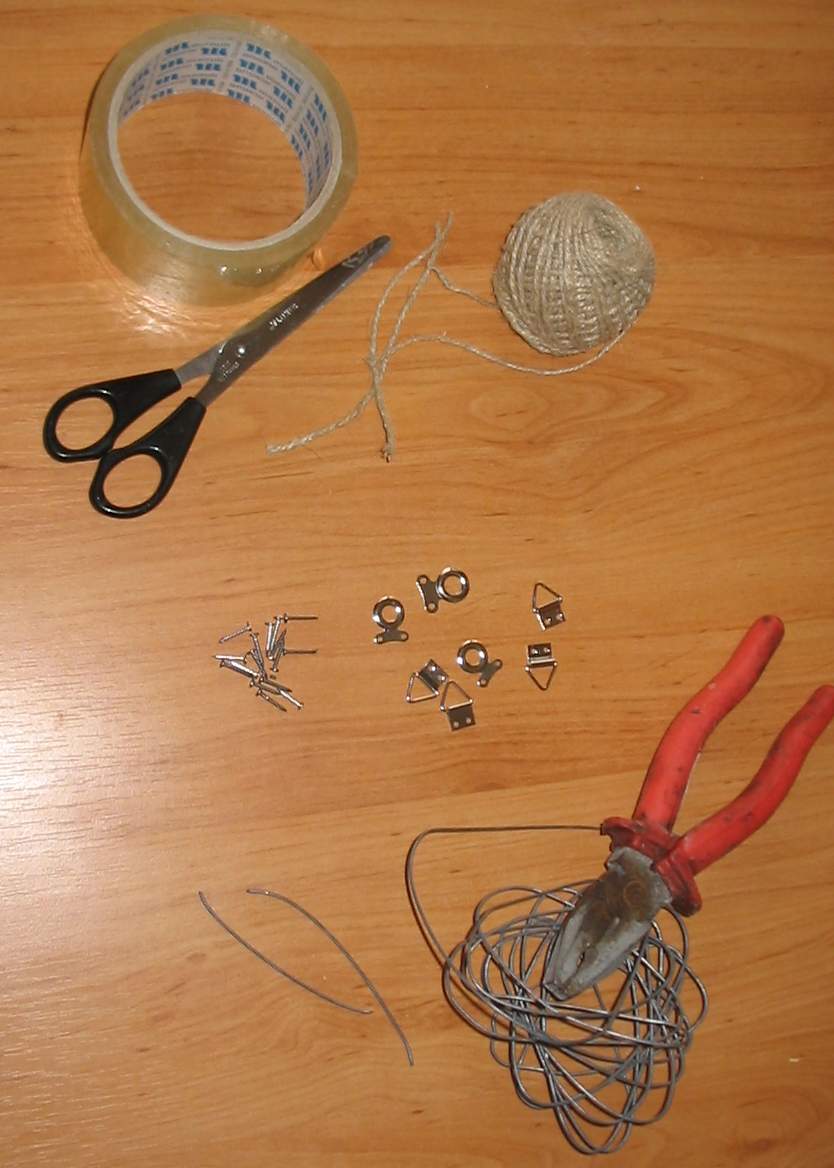 - potrebujeme lepiacu pásku, nožnice, jutový špagát, háčiky na obrazy (okrúhle, trojuholníkové), malé klinčeky, drôt, kliešte |