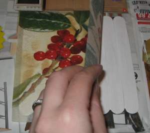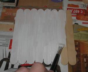 paličky natrieme bielym latexom (alebo bielou akrylovou farbou), najlepšie 2 vrstvy, po uschnutí pokračujeme klasickou servítkovou technikou, čiže natrieme celú plochu lepidlom na servítky |