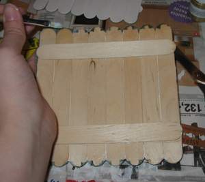 nalepíme aj druhú priečnu paličku, zvislé zarovnáme, snažíme sa aby neboli medzi nimi medzery, necháme zaschnúť |